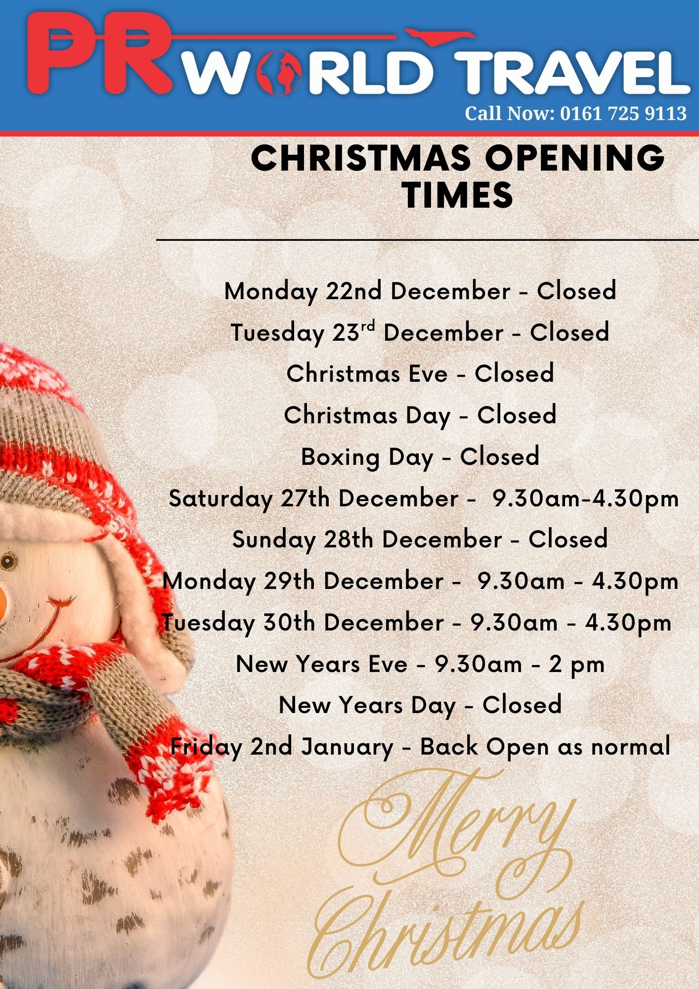 Christmas Opening Hours 23-12-2025 prworldtravel Comments are closed Merry Christmas to all of our customers! Please Note our Christmas Opening Times: We will be closed from Saturday 20th December and reopen on Saturday 27th December!